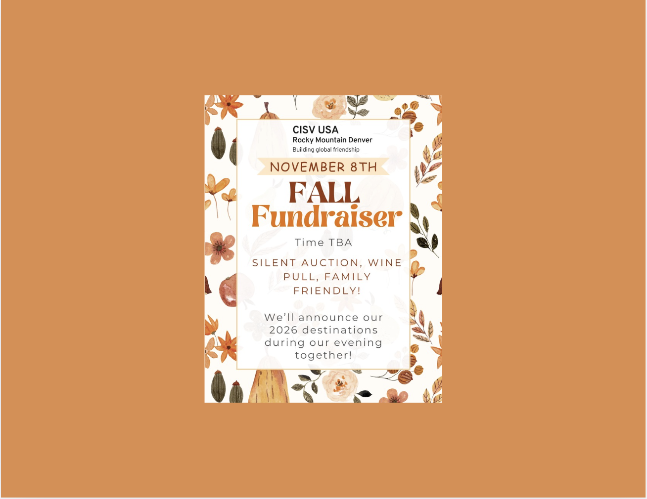 Join the CISV Rocky Mountain Denver community for our annual Fall Fundraiser! Bring your family and friends for a fun evening featuring a silent auction, community connection, and the exciting reveal of our 2026 CISV programs. More details coming soon!